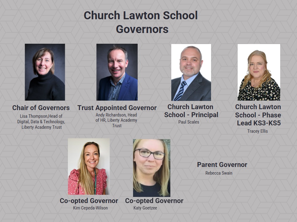 Church Lawton School Transformation Management Board ('TMB') is made up of representatives from the central trust team and the local area and covers a number of governor roles. School governors have a key role in setting the strategic direction of a school, ensuring the accountability of teachers and staff, and thinking critically about the welfare of a school. For further information, see our Liberty Governance Plan and Scheme of delegation.